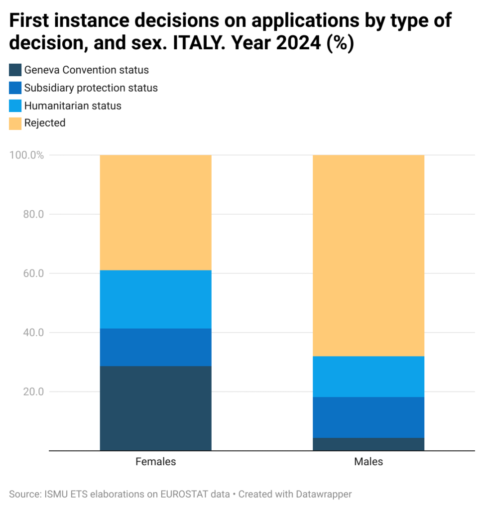 29% of refugees in Italy are women. In 2024, 68,000 protection applications were submitted by men and 10,000 by women in Italy. Among the women, over 6,000 (60%) received a positive outcome, while negative outcomes predominated for men.